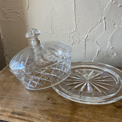 Magnifique beurrier rond en verre taillé brillant avec son couvercle bombé et poignée. Il peut avoir de multiples fonctions comme servir du beurre, des petits gâteaux, du fromage ou des fruits. Très belle pièce qui épatera vos convives.