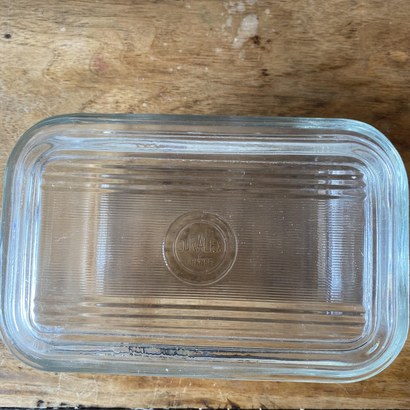 Beurrier DURALEX FRANCE vintage des années 70 en verre transparent avec son couvercle.
