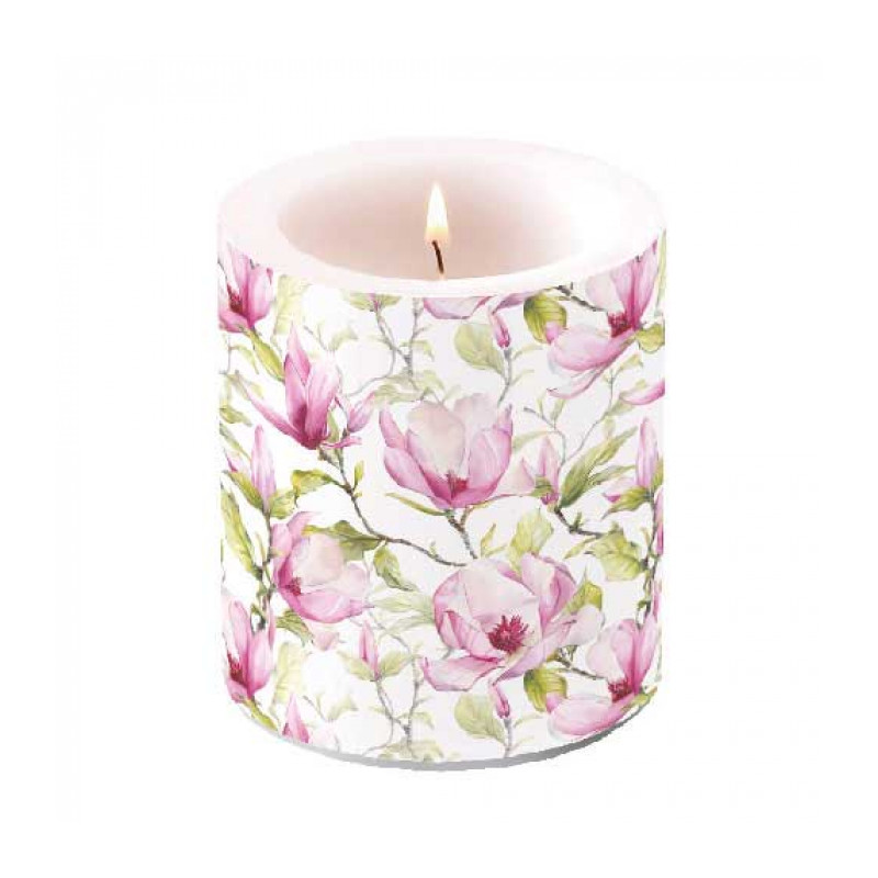 Bougie motif Magnolia sans odeur pour illuminer vos tables lors de vos repas en intérieur ou extérieur.