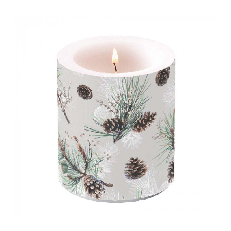 Bougie motif "Pomme de pin" fond blanc sans odeur pour illuminer vos tables lors de vos repas en intérieur ou extérieur.