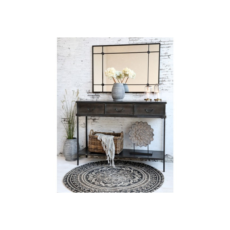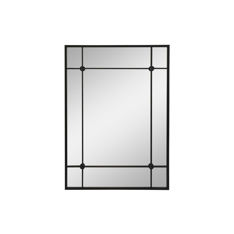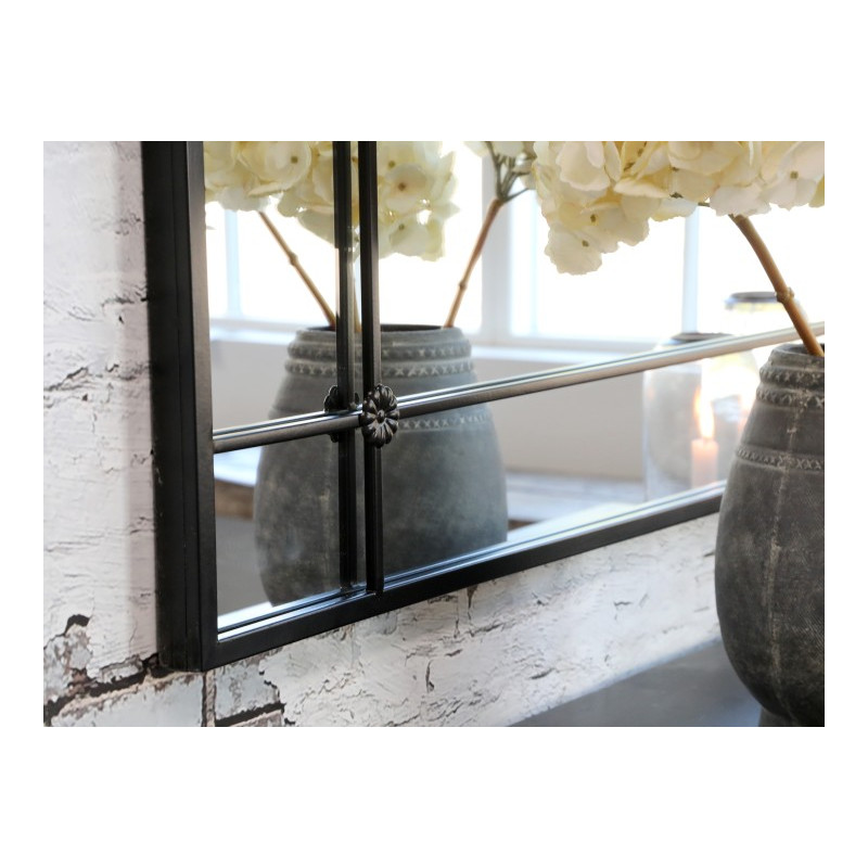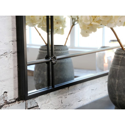 Superbe miroir en fer noir de style industriel. Il pourra se suspendre à l'horizontale ou à la verticale en fonction de vos envies. Joli détail de fleurs sur le fer.