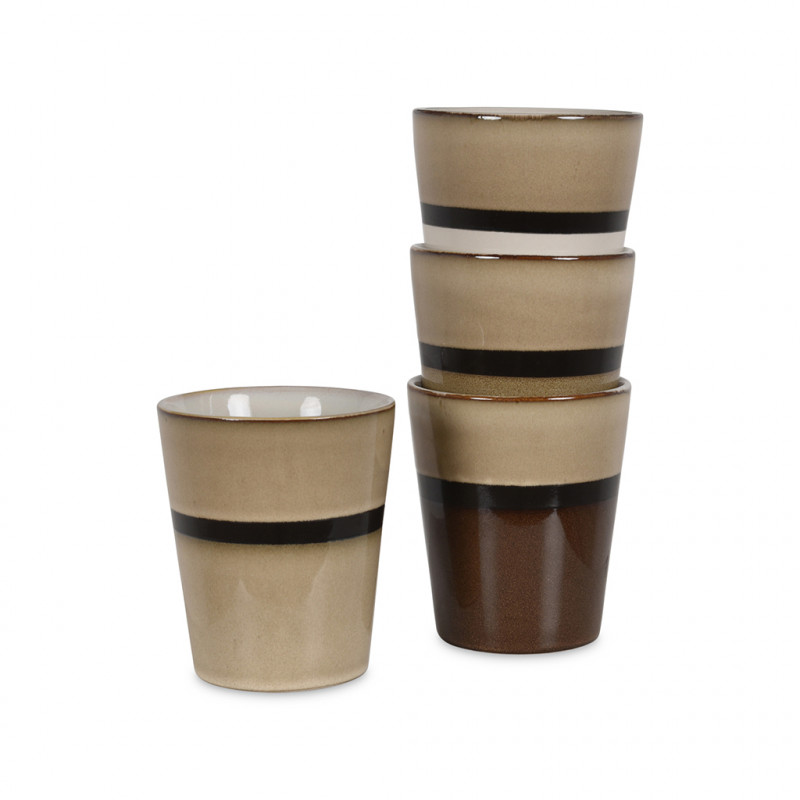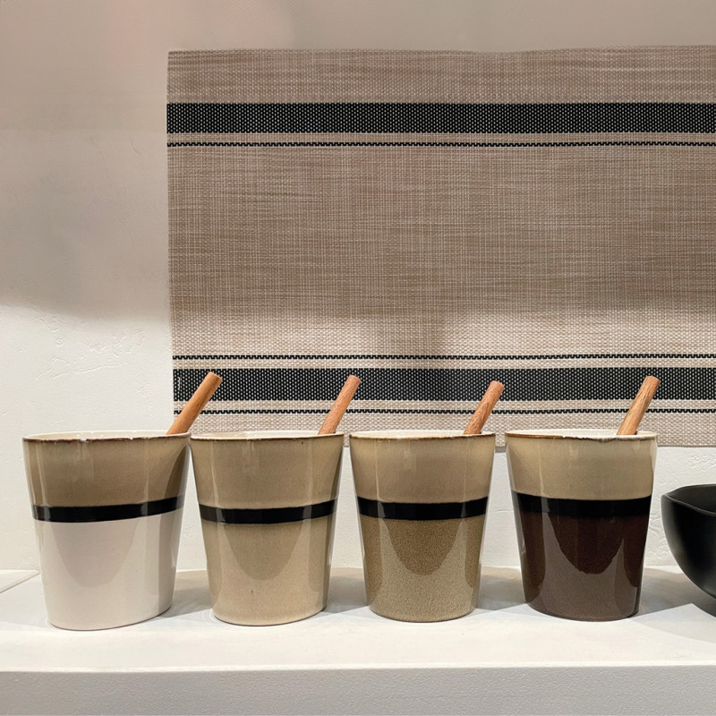 Ces gobelets sont rehaussés d'un délicat filet brun clair qui souligne élégamment les courbes de chaque pièce, ajoutant une touche d'authenticité.